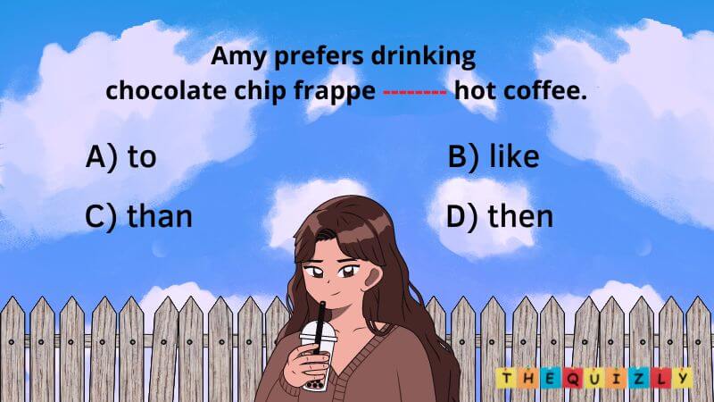 QUESTION: Fill in the blank. Amy prefers drinking chocolate chip frappe -------- hot coffee. A) to B) like C) than…